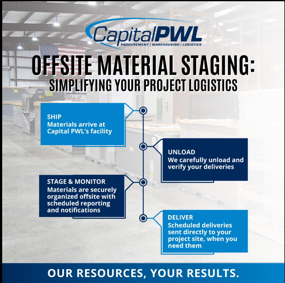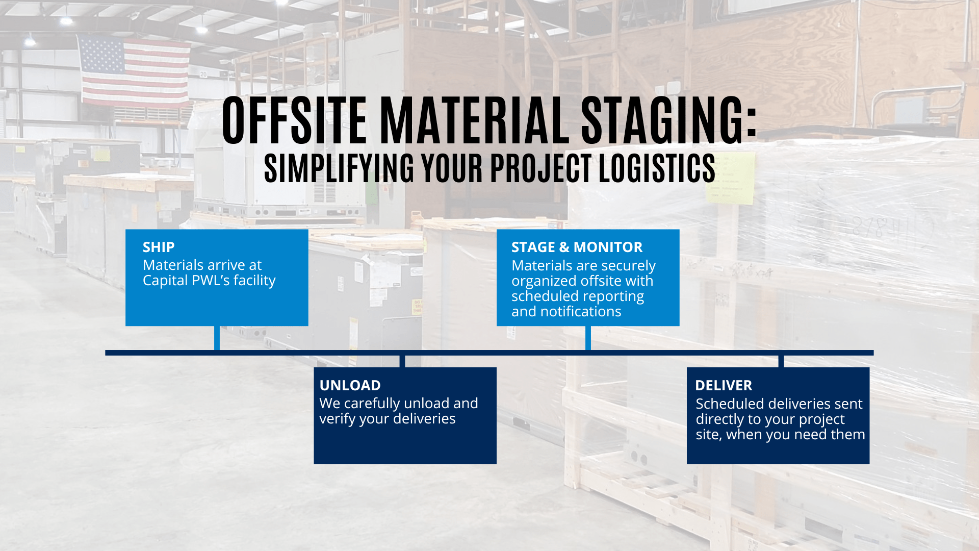 Capital PWL supports efficient job site execution through expertly staged deployments. We kit and prep materials based on project phase, trade, or work zone—minimizing job site confusion and reducing overhandling. Materials are palletized, labeled, and protected to ensure they arrive in perfect condition and in the order they’re needed.